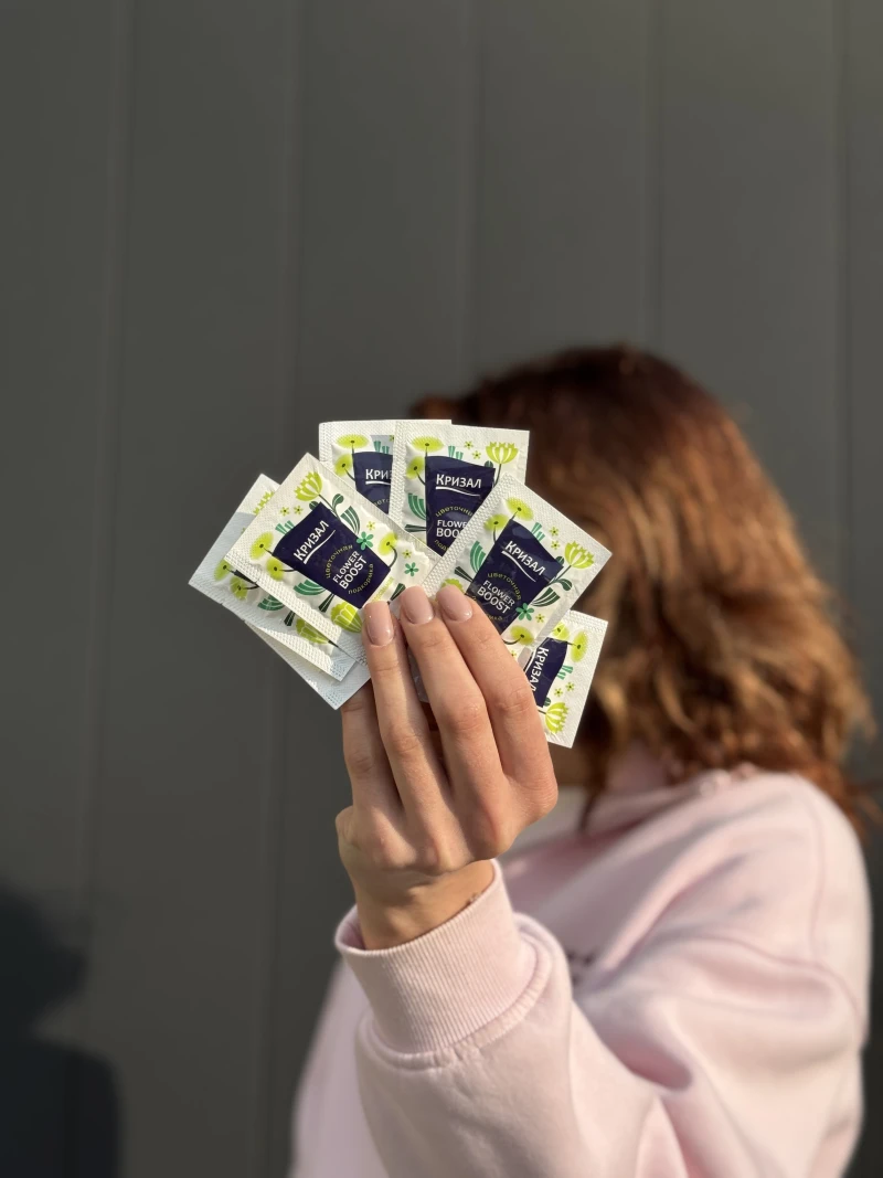 Кризал - это специальная подкормка для срезанных цветов, которая помогает продлить их свежесть и красоту🤍 Инструкция по применению: -> Растворите содержимое пакетика в чистой воде (примерно 0,5–1 литр). -> Перед тем как поставить цветы в вазу, подрежьте стебли секатором или острым ножом на 1–2 см под углом -> Удалите листья, которые могут оказаться в воде. -> Поставьте цветы в подготовленный раствор и не меняйте воду - достаточно просто при необходимости подливать её